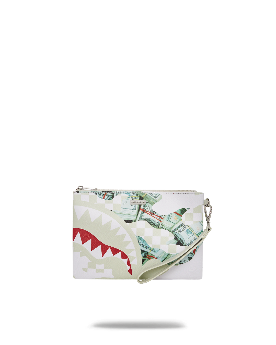 Pouch with removable wristlet strap. Handle on front panel. Zip Closure