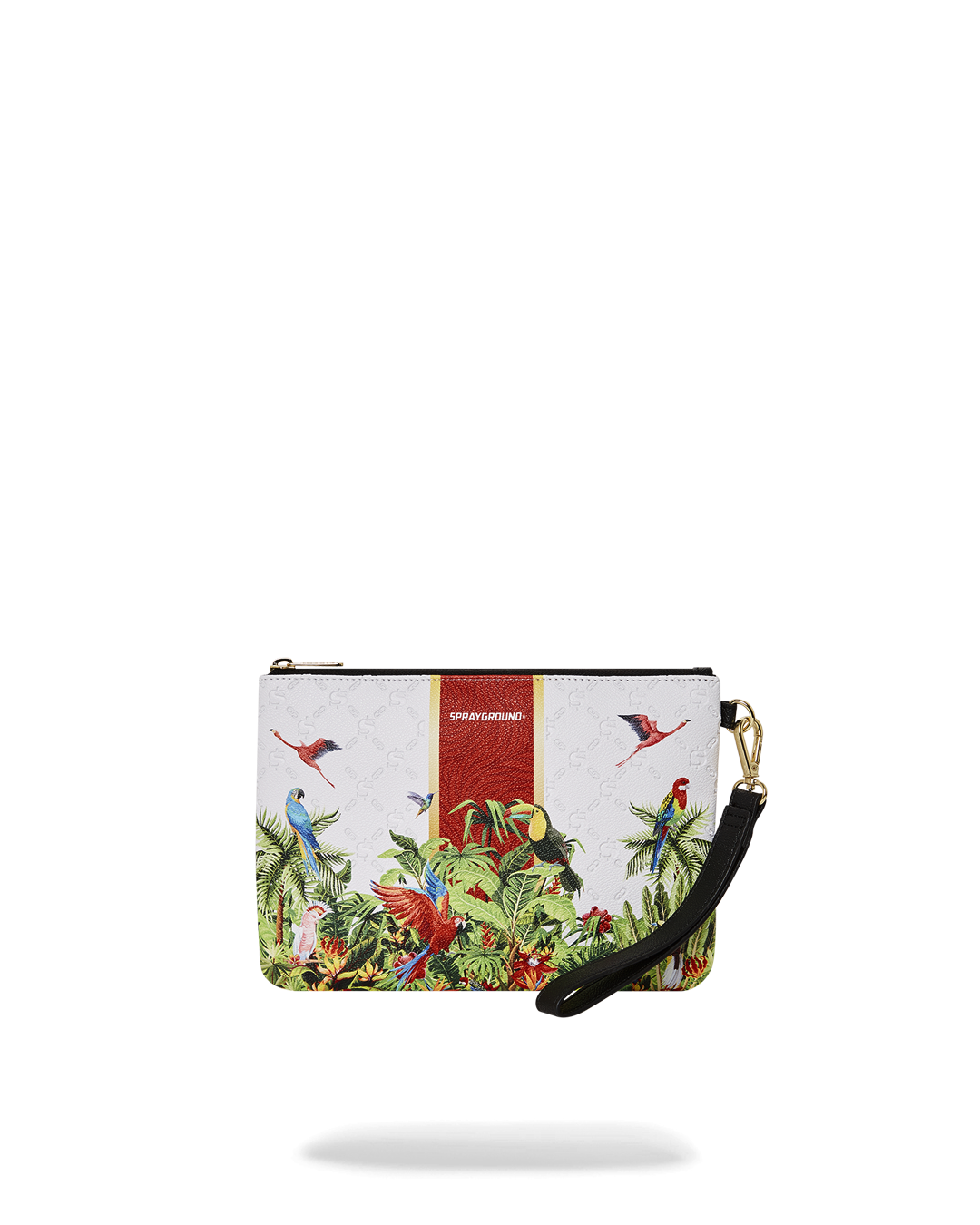 Pouch with removable wristlet strap. Handle on front panel. Zip Closure