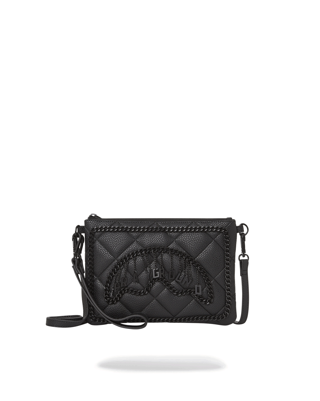 100% PVC quilted black faux leather featuring black chain hardware and hanging charm logo.