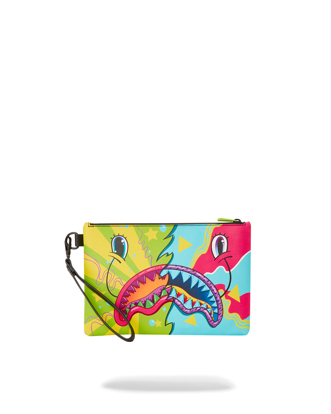 Pouch with removable wristlet strap. Handle on front panel. Zip Closure